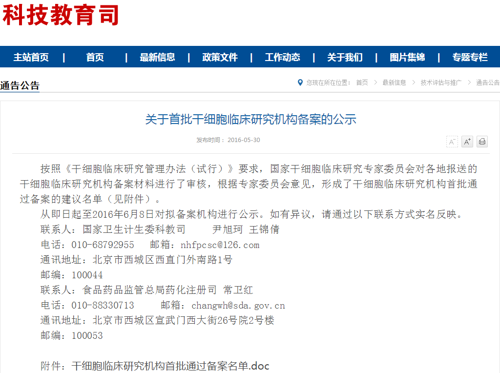按照《干細(xì)胞臨床研究管理辦法(試行)》要求,國家干細(xì)胞臨床研究專家委員會(huì)對(duì)各地報(bào)送的干細(xì)胞臨床研究機(jī)構(gòu)備案材料進(jìn)行了審核,根據(jù)專家委員會(huì)意見,形成了干細(xì)胞臨床研究機(jī)構(gòu)首批通過備案的建議名單(見附件)。 從即日起至2016年6月8日對(duì)擬備案機(jī)構(gòu)進(jìn)…